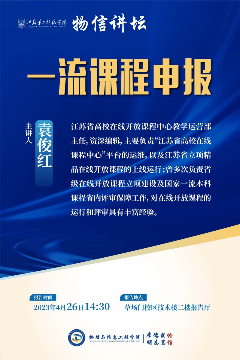 4月26日下午,物信学院在草场门校区教育技术楼报告厅举办一流课程申报培训会。培训会特邀江苏省高校在线开放课程中心教学运营部袁俊红主任为主讲人,物信学院院长朱辉生主持,学院60多名教师参加了培训。