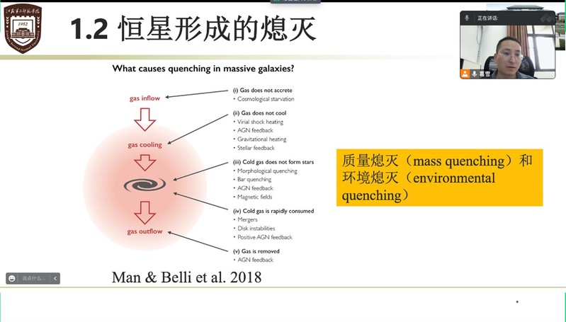 葛雪老师分享主题为早型星系的形成和演化。葛老师首先介绍了星系在颜色-星等图上的分布以及星系演化的基本理论。随后,基于哈勃分类阐述了研究S0星系的意义,最后介绍了S0星系PGC 26218恒星形成的熄灭过程。