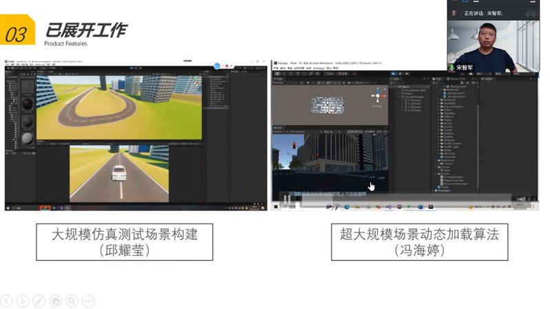 评估,文明驾驶场景测试等场景测试;基于现实中发生交通事故的“边缘案例”,实现了坎驾驶决策/控制算法的测试与开发;最后,宋老师展示了其指导学生完成的大规模仿真测试场景构建、超大规模场景动态加载算法、平行泊车算法实现及仿真、基于ACC自适应巡航算法实现及仿真验证等成果,该项研究在智能网联汽车安全方面具有广泛的应用前景。