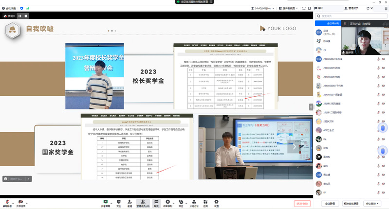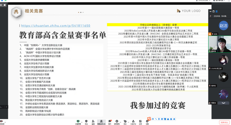 会议开始赵洁老师介绍了两位同学的基本情况。陈华强同学是我校计算机科学与技术专业大学四年级学生。他于2023年12月荣获了“国家奖学金”和“校长奖学金”。在校三年多的时间,先后参加了“蓝桥杯”全国软件和信息技术专业人才大赛、全国大学生数学建模竞赛等近20项省级以上高水平学科竞赛,均获得优异成绩。同时考取了工业互联网开发工程师、数据库系统工程师等多个职业资格证书。袁浩男同学是我校计算机科学与技术专业专转本二年级学生,目前在杭州端点科技实习,主要从事Erda云原生平台的开发和维护。在校一年的时间,他曾获得“蓝桥杯”全国软件和信息技术专业人才大赛省级一等奖、国家级三等奖。