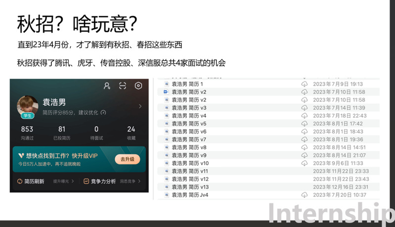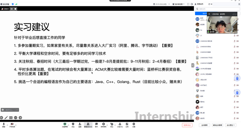 袁浩男同学从专业学习和求职实习两方面分享了自己的经历和经验。讲述了自己备考蓝桥杯、自学数据结构,“完成第一个贪吃蛇程序后,自己的编码之路一发不可收拾”,生动地启发了同学们要多尝试自己感兴趣的专业领域,在课程之外主动发展和钻研的重要性。同时结合暑期提前批招聘、秋季招聘、春季招聘,从单位需求到个人选择多方位分享了自己的求职经历。特别提醒到,对于计算机类专业同学实习经历的重要性,不必拘泥于毕业求职季,同学们可尽早在大学间隙尤其暑期,争取宝贵的实习机会。